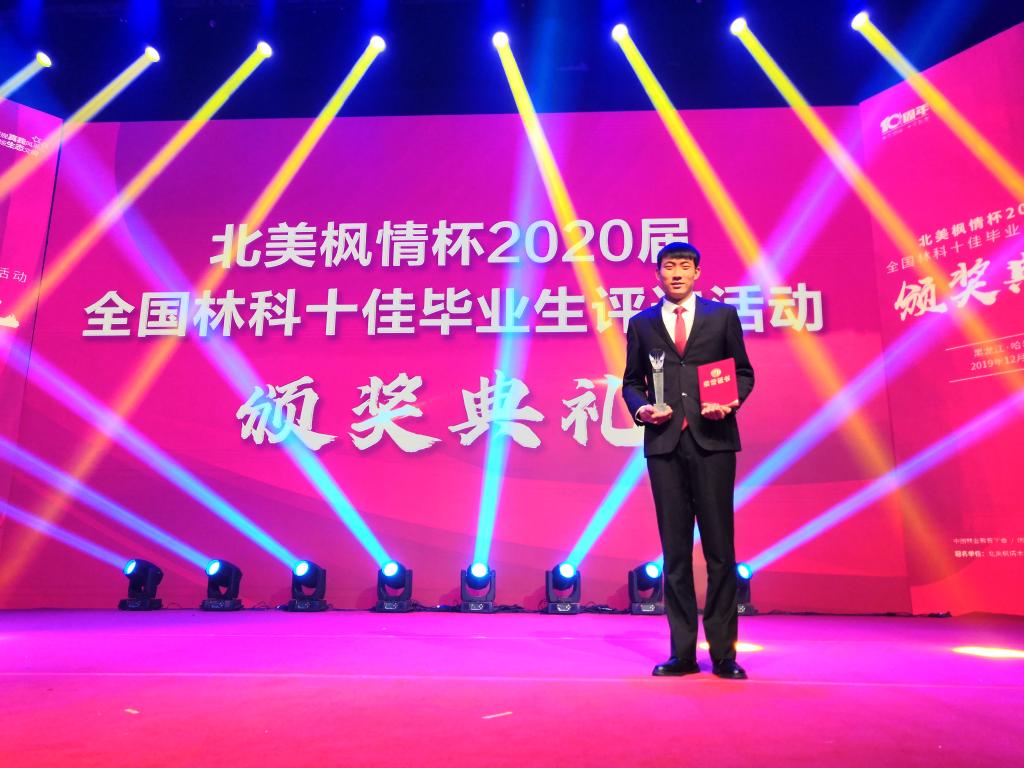 2019年12月30日,由中国林业教育学会和国家林业局人才开发交流中心共同举办的“北美枫情杯”2020届全国林科十佳毕业生评选表彰大会在东北林业大学举行。我院生态环境工程分院石健阳同学荣获高职组“全国林科十佳毕业生”称号,孙熙超、刘一辰、王松松三位同学荣获高职组“全国林科优秀毕业生”称号。