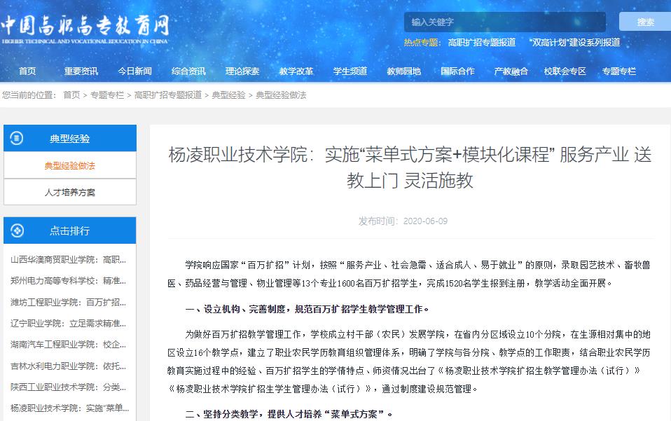 6月9日,教育部职业教育与成人教育司公布了高职扩招典型经验案例,我院《实施“菜单式方案+模块化课程”,服务产业送教上门灵活施教》百万扩招教学管理案例和农业生物技术人才培养方案成功入选。陕西省有3所院校案例入选,入选2个案例的仅有2所院校。