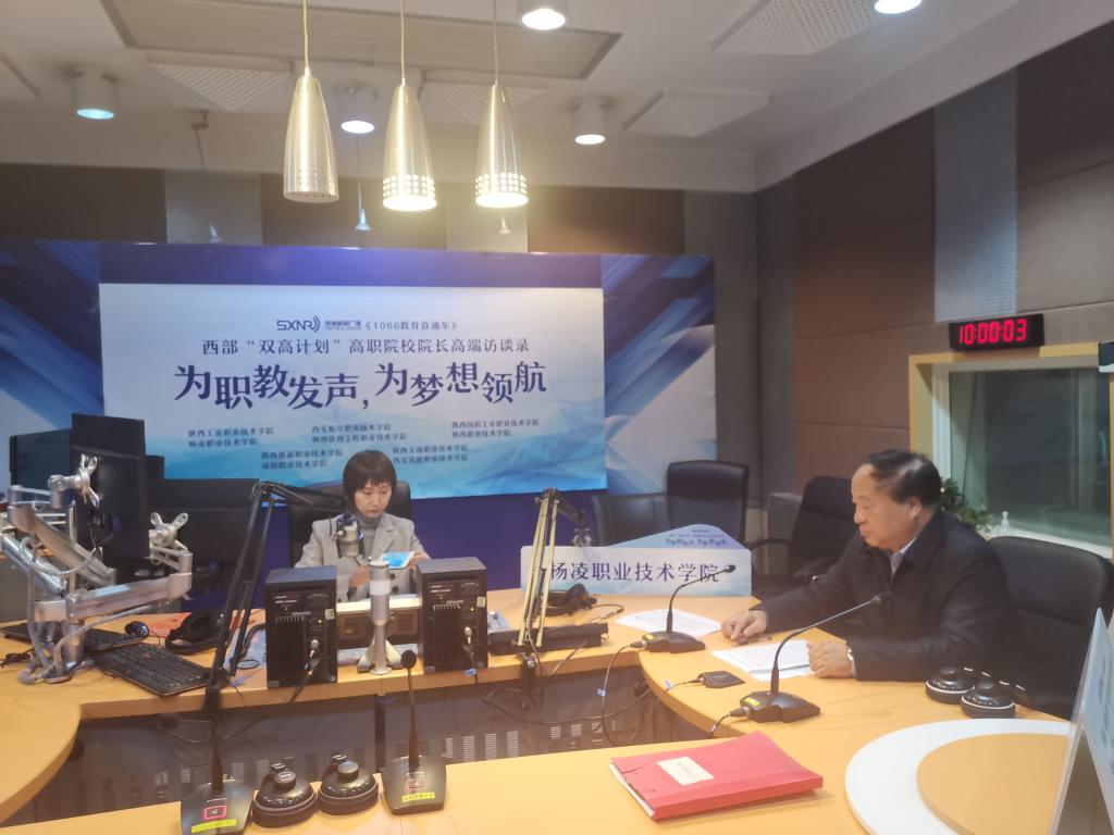 11月3日上午,校长王周锁受邀做客陕西新闻广播《1066教育直通车》节目直播间作首场《西部“双高计划”院长高端访谈录》,就学校基本情况、特色专业、“双高计划”建设思路和主要目标、“双高”计划重要任务、进展情况和效果等问题接受访谈。