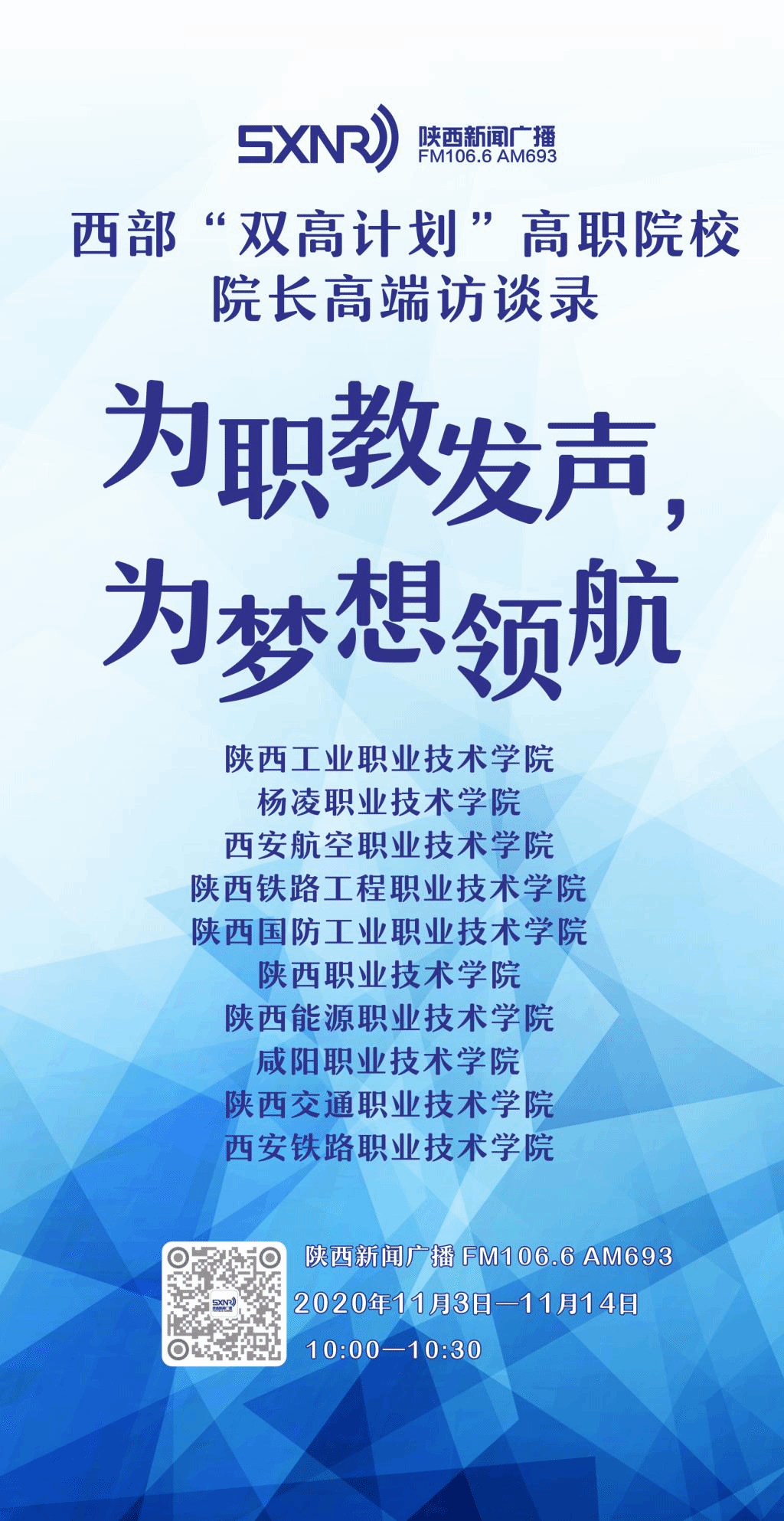 传播名校风采,搭建职场桥梁,提升综合素质,成就精彩人生。陕西广播电视台新闻广播1066《教育直通车》。