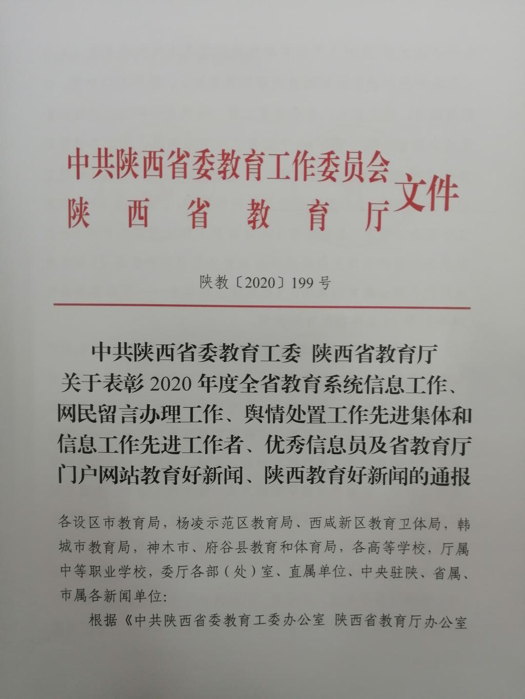 12月25日,2020年度全省教育系统信息工作表彰暨培训会在西安召开。我校新闻作品《杨凌职院“以文育人” 为学生成才提供良好的精神土壤》获省教育厅门户网站教育好新闻。同时,我校解晓盈同志荣获全省教育系统信息工作优秀信息员。