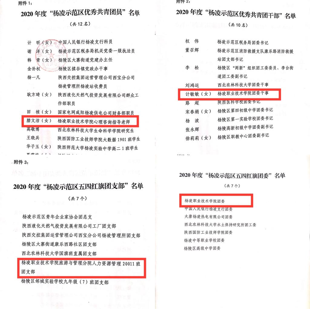 为表彰先进、树立典型,引导和激励广大团员、团干部和各级团组织奋发进取、再创佳绩,在五四青年节来临之际,共青团杨凌示范区团工委对示范区团员青年、团干部和各级团组织进行了表彰。我校团委获2020年度“杨凌示范区五四红旗团委”称号,旅游与管理学院人力资源管理20011班团支部荣获“杨凌示范区五四红旗团支部”称号;教师计敏敏荣获“杨凌示范区优秀共青团干部”称号;教师腊文洁荣获“杨凌示范区优秀共青团员”称号。