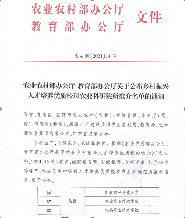 此次推介的乡村振兴人才培养优质校,按照“广泛推荐、优中选优、引领示范”的原则遴选,经院校自荐、省级推荐、专家交叉评审、社会公示等环节产生,最终在全国众多申报单位中优先评选了101所优质校和农业科研院所,陕西省3所学校入选,我校位列其中。