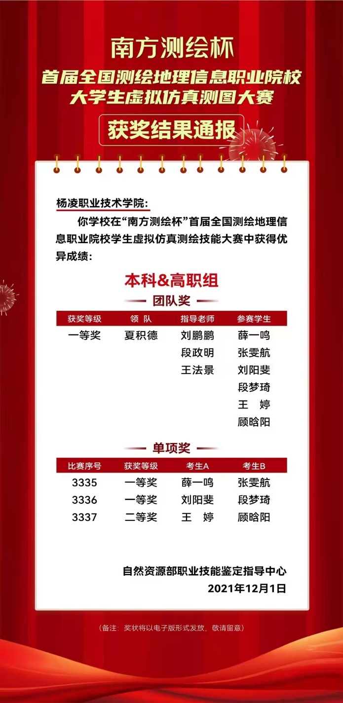 12月1日,“南方测绘杯”首届全国测绘地理信息职业院校大学生虚拟仿真测图大赛落下帷幕。学校的3支代表队获单项一等奖2项,二等奖1项,学校被授予团体一等奖。