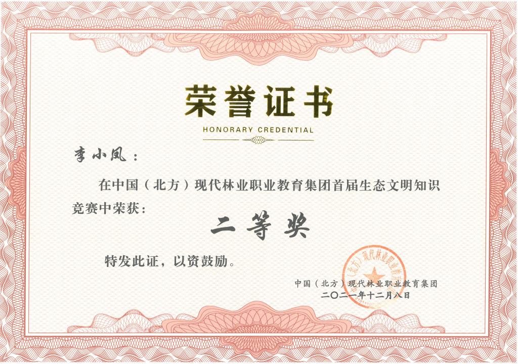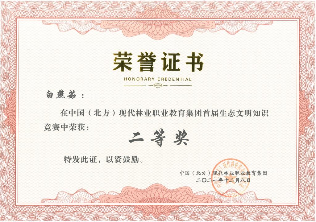 11月25日30日中国(北方)现代林业职业教育集团举办首届生态文明知识竞赛活动学校生态环境工程学院教师赵新宇、白燕茹以及学生李小凤均荣获二等奖。