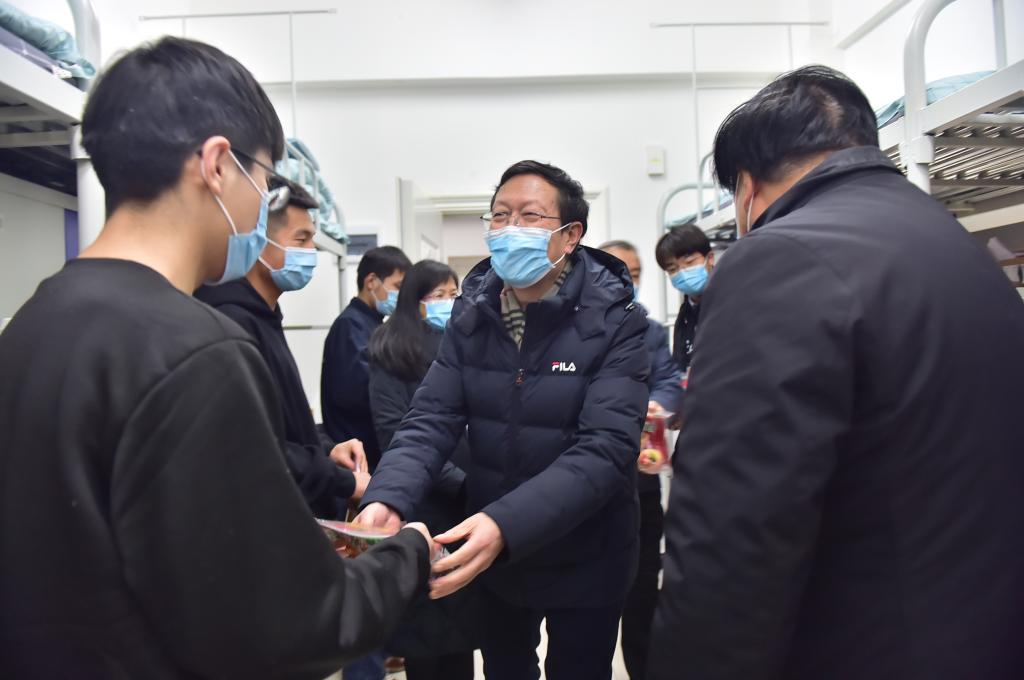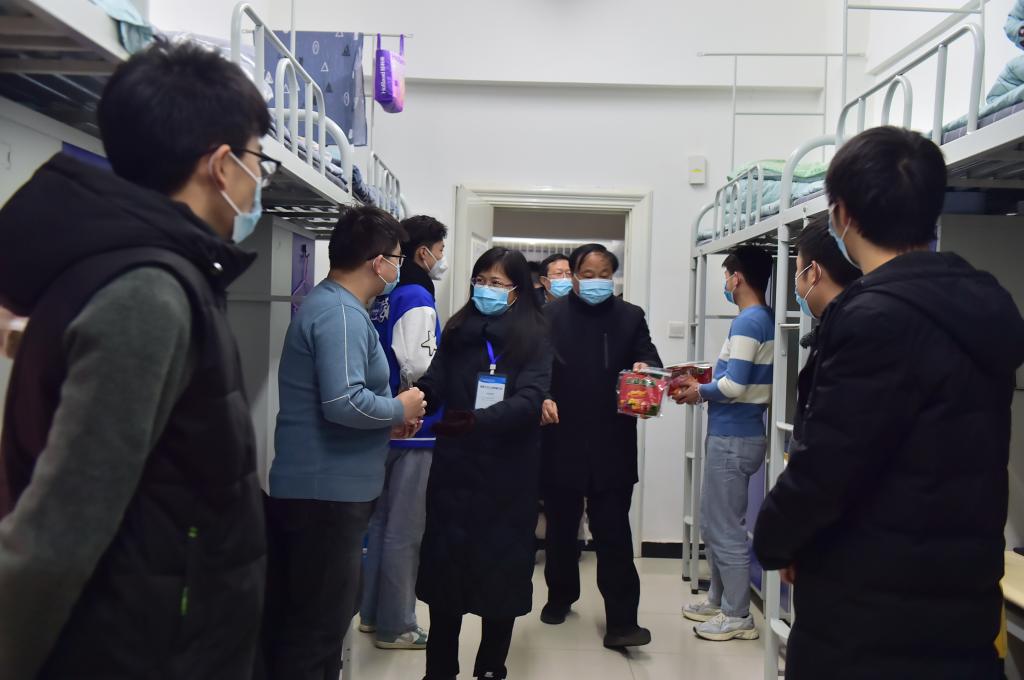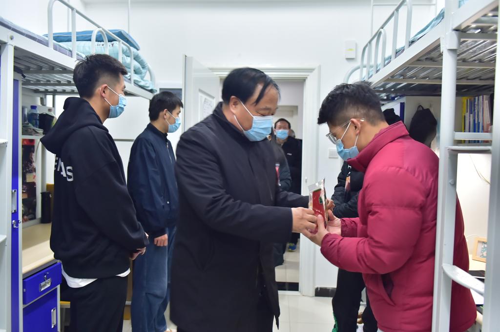 每到一个宿舍,学校领导们都亲切的与同学们交流,了解大家的思想动态和学习生活情况,并通过“苹”安“橘”祥的新年礼物,祝大家在新的一年平安吉祥、学业有成,为取得更大成绩、实现自我梦想奠定扎实基础。领导们叮嘱大家,一是要科学防疫、健康成长,在做好自我防护的同时,合理安排好学习生活,保持积极向上、理性思考的精神状态。二是要加强与老师、家人的沟通交流,理解当前特殊时期学校所采取的管理措施及规定,坚定战胜困难的信念信心,在防疫斗争中磨炼意志、淬炼思想,配合学校共同做好疫情防控工作。