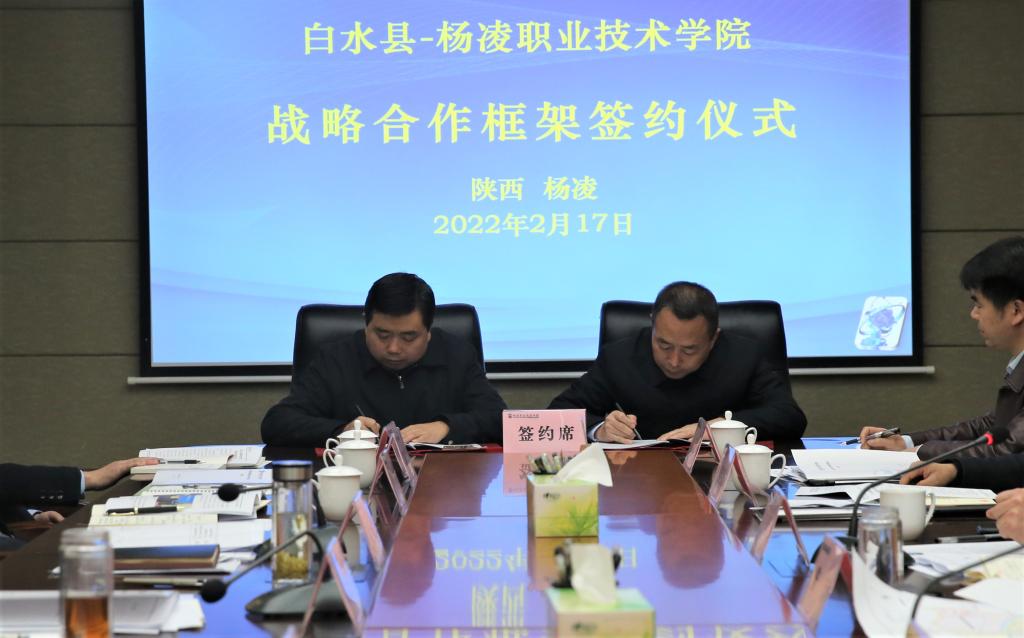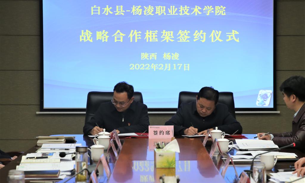 杨凌职院党政办公室、教务处、产教融合处(创新创业学院)、科技与教育研究处、继续教育与培训学院、村干部(农民)发展学院、药物与化工学院、动物工程学院、生物工程学院、生态与环境工程学院等相关负责人,白水县政府办、水务局、发改局、教育局、农业农村局、乡村振兴局、工信局、卫健局、人才办、职业中学负责人参加了签约仪式。