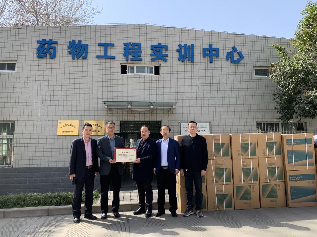 3月4日下午,陕西郝其军制药股份有限公司向我校捐赠一批药品胶囊壳。药物与化工学院院长周博代表学校接受捐赠,产教融合处副处长张英杰为公司总经理张朝毅颁发捐赠证书。