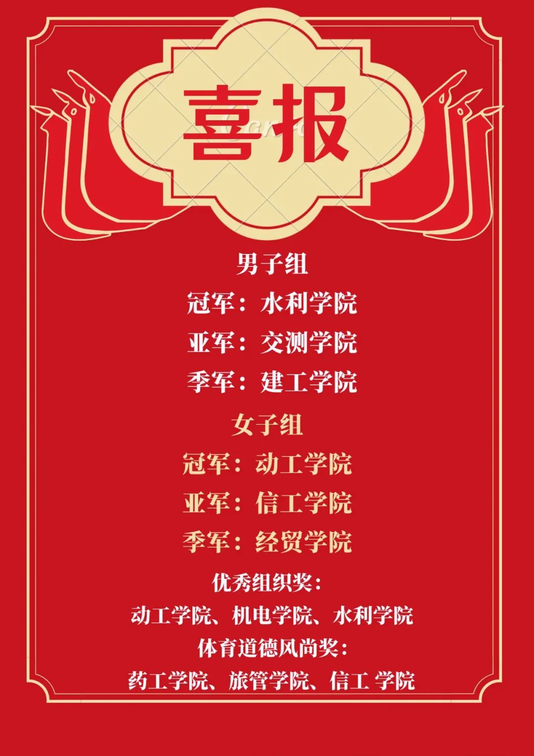本次比赛各学院共派出19支男女代表队、300余名运动员和教练参赛。比赛分小组赛和淘汰赛、教工联队表演赛等,共50多场比赛。女子组决赛中,动物工程学院以46:18大比分战胜信息工程学院夺冠。男子组决赛中,水利工程学院以57:50比分战胜交通与测绘学院夺冠。