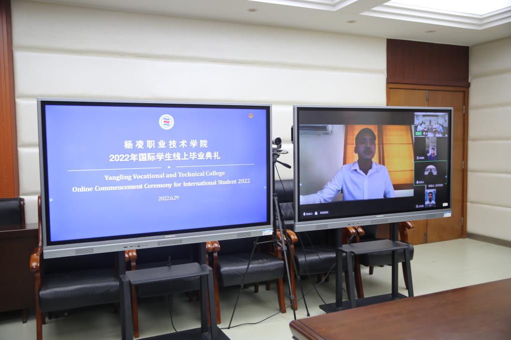 我国著名跨国集团、我校校企战略合作单位陕西高山流水集团的总经理徐小川先生通过线上平台对今天的毕业典礼致辞。徐小川代表高山流水集团公司欢迎我校国际学生毕业生到高山流水集团的境外企业工作,希望这些国际学生用在我们学校学到的技术和标准,发展公司的业务,促进当地经济的发展,为 “一带一路”建设做出贡献,同时希望进一步加强公司与我校在国际合作领域的校企合作,共同培养海外具有中国技术标准的本土化人才。