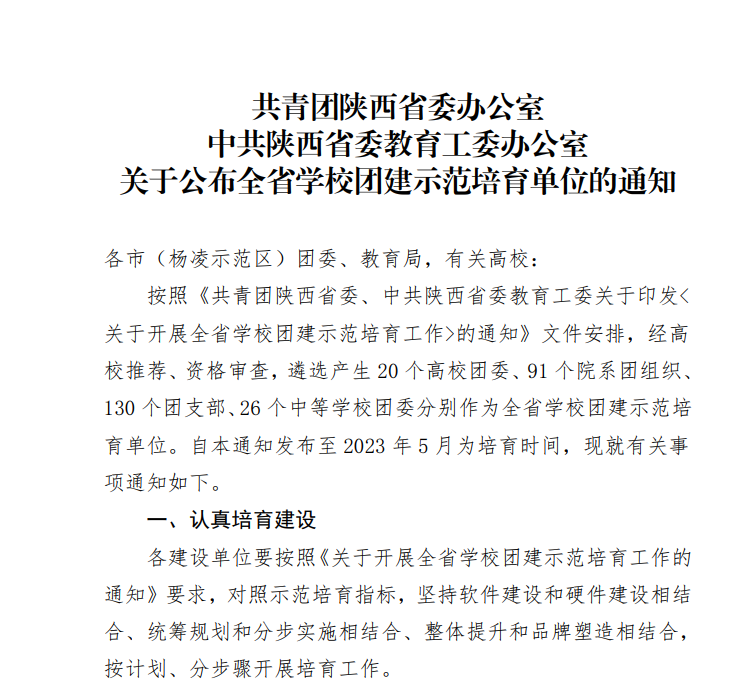 据悉,按照《共青团陕西省委、中共陕西省委教育工委关于印发<关于开展全省学校团建示范培育工作>的通知》文件安排,经高校推荐、资格审查,遴选产生20个高校团委、91个院系团组织、130个团支部分别作为全省学校团建示范培育单位。培育时间2022年7月至2023年5