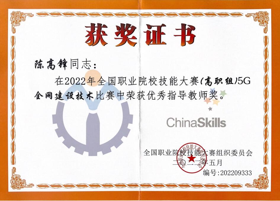 8月22日至23日,2022年全国职业院校技能大赛高职组“5G全网建设技术”赛项在济南职业学院举办,来自全国28个省、56支代表队、112名选手参加了比赛。经过8个小时的激烈比拼,我校信息工程学院学生郑嘉昊、曹文森以总分排名全国第一的成绩,荣获一等奖第一名,取得我校自参赛以来历史最好成绩指导教师康晋、陈高锋荣获大赛优秀指导教师奖