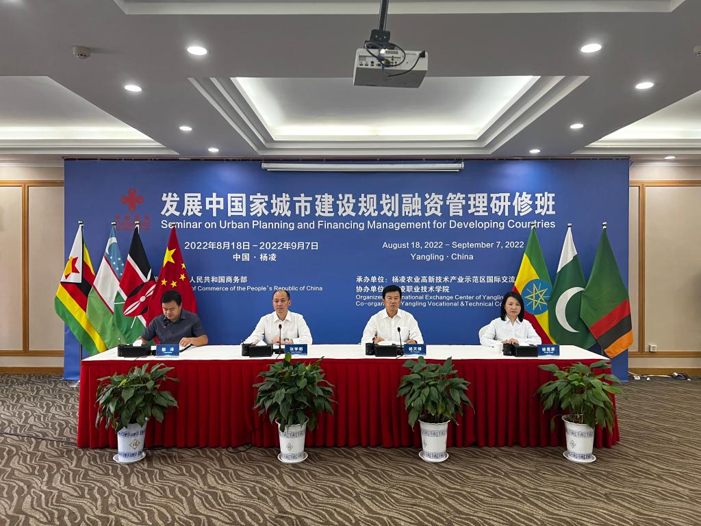 9月7日,我校协办的国家商务部2022年发展中国家城市建设规划融资管理研修班结业典礼举行,省商务厅国际经济合作处一级调研员昌利,杨凌示范区管委会副秘书长杨天锋,我校国际合作交流处副处长杨雪霁出席结业典礼,来自埃塞俄比亚、肯尼亚、巴基斯坦等国的25名学员在线上参加了开班仪式,示范区外事办副主任张学明主持了结业典礼。
