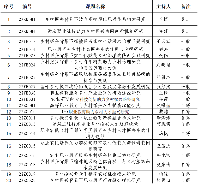 近日,陕西职业教育乡村振兴研究院公布2022年度研究课题立项结果,我校20项课题获批,其中重点课题2项、一般课题8项、自筹课题10项。