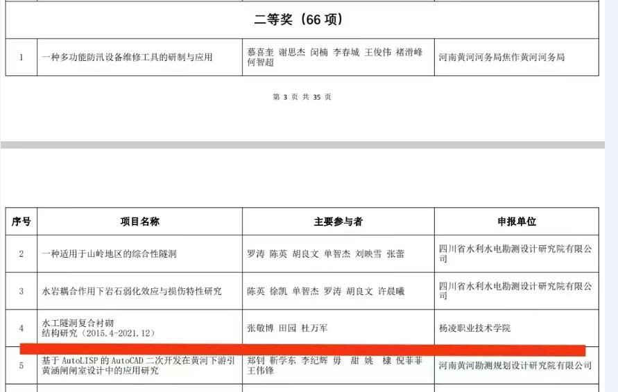 10月19日,中国水利教育协会公布第二届水利职工创新成果获奖名单,水利工程学院张敬博、田园、杜万军团队的项目荣获创新成果二等奖,赵彦琳、张宇峰、赵英团队和李特、郝红科、郭旭新团队的项目分别荣获创新成果三等奖,田佳、任碧芸团队和郭庆、杨川、刘儒博团队的项目分别荣获教育理论研究成果三等奖张宇峰、赵彦琳、张宏团队的项目荣获创新成果优秀奖。我校参赛项目总数和获奖数量在所有申报该奖项的职业院校中位居前列。