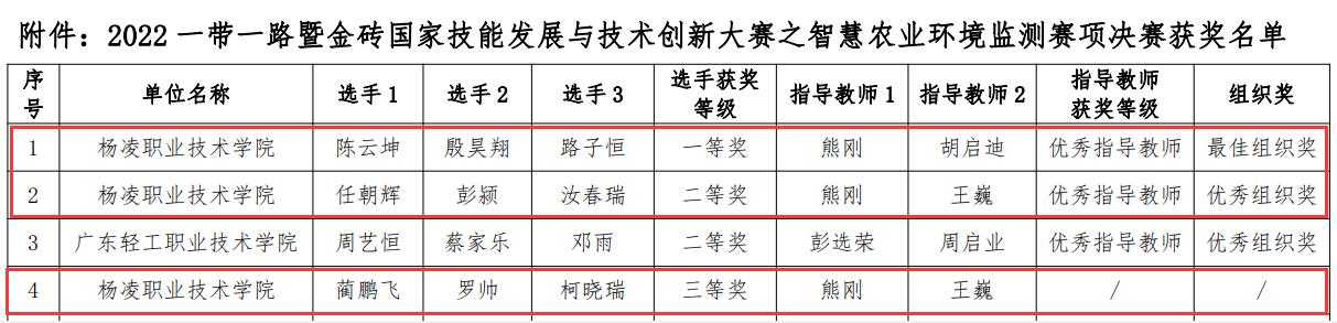 11月4日至6日,2022年一带一路暨金砖国家技能发展与技术创新大赛智慧农业赛项在福建省厦门市结束。我校师生获“智慧农业环境监测”赛项教师组二等奖、学生组一等奖、三等奖,学校获最佳组织奖。