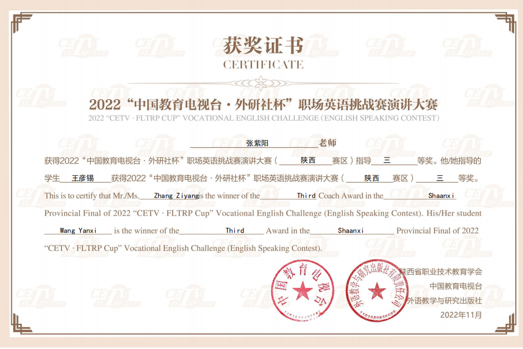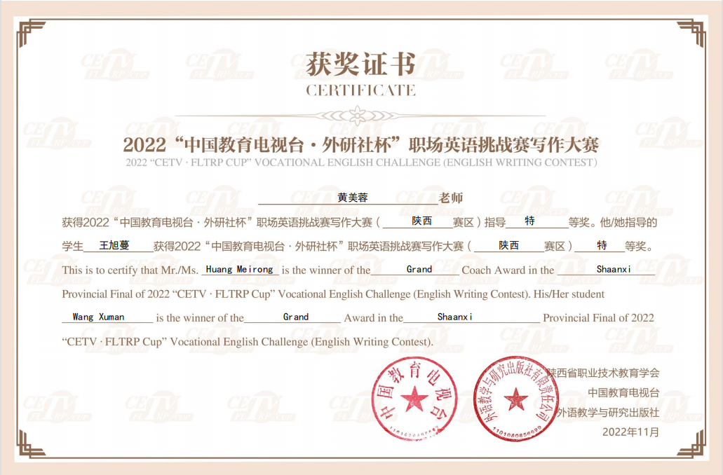11月12日,2022“中国教育电视台•外研社杯”职场英语挑战赛陕西赛区比赛顺利结束。经过激烈角逐,我校学生王旭蔓、任宗尧分别获写作比赛特等奖、一等奖;何诗琪、王彦锡分别获演讲比赛二等奖、三等奖。文理学院教师王雷、黄美蓉、陈折、张紫阳获优秀指导教师。