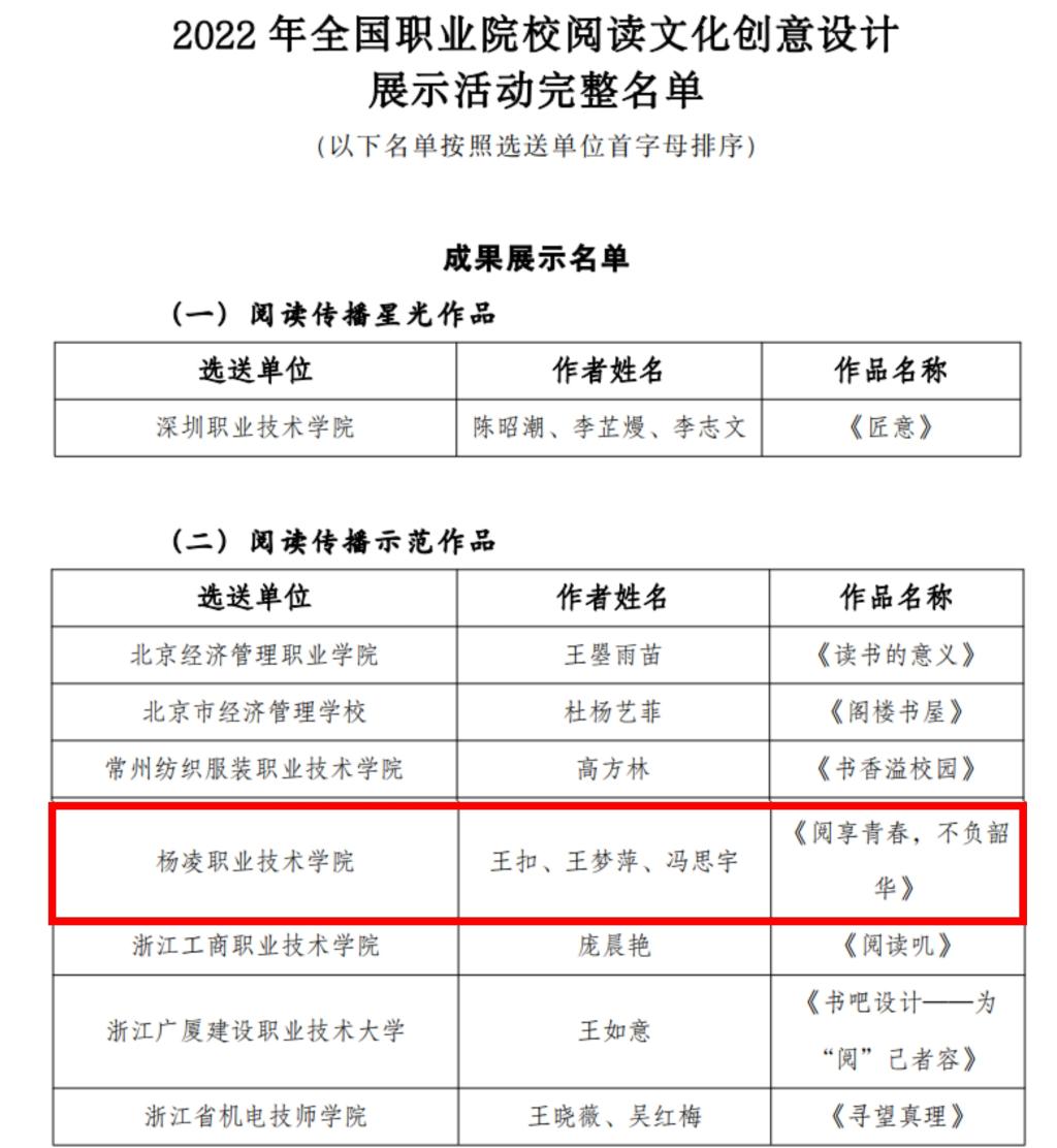 近日,2022年全国职业院校阅读文化创意设计展示活动获奖名单公布。我校获优秀组织单位;选送的作品入选“阅读传播示范作品”1件、“阅读传播创意作品”6件;生态环境工程学院教师王花蕾获优秀指导老师。