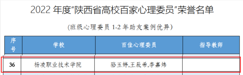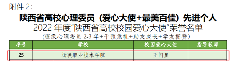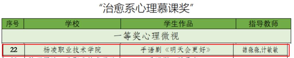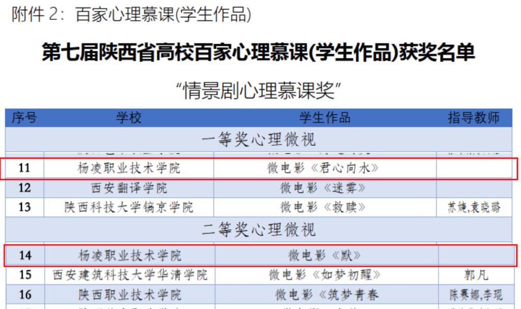其中,建筑工程学院学生王闫星“陕西省高校校园爱心大使”信息工程学院学生潘飞“陕西省高校最美心理委员”经济与贸易学院学生骆玉婷建筑工程学院学生王辰希水利工程学院学生李嘉炜“陕西省高校百佳心理委员”。荣获第七届陕西省高校百家心理慕课作品的包括:水利工程学院学生王子璋作品微电影《君心向水》“情景剧心理慕课奖”一等奖心理微视建筑工程学院学生作品手语剧《明天会更好》“治愈系心理慕课奖”一等奖心理微视旅游与管理学院学生周怡盼作品微电影《默》“情景剧心理慕课奖”二等奖心理微视