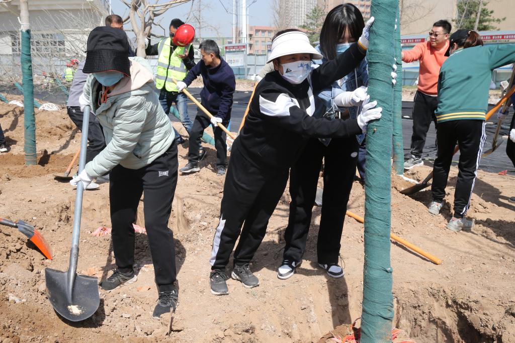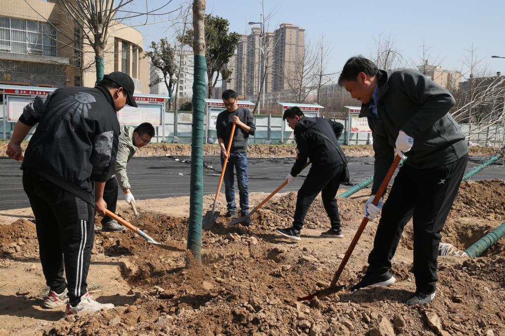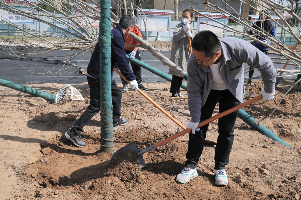 干部职工密切配合共植一棵树