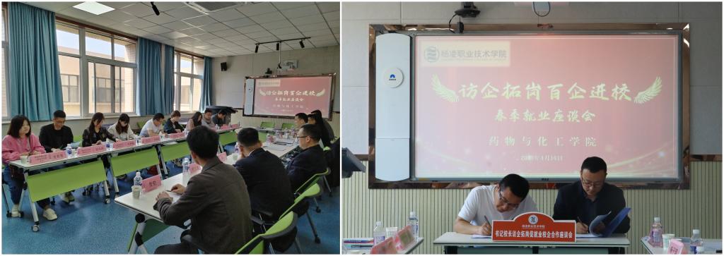 药物与化工学院与陕西东科制药有限责任公司等9家企业代表进行座谈,并与陕西量维生物工程有限公司、杨凌金海生物技术有限公司、杨凌萃健生物工程技术有限公司签订校企合作协议。