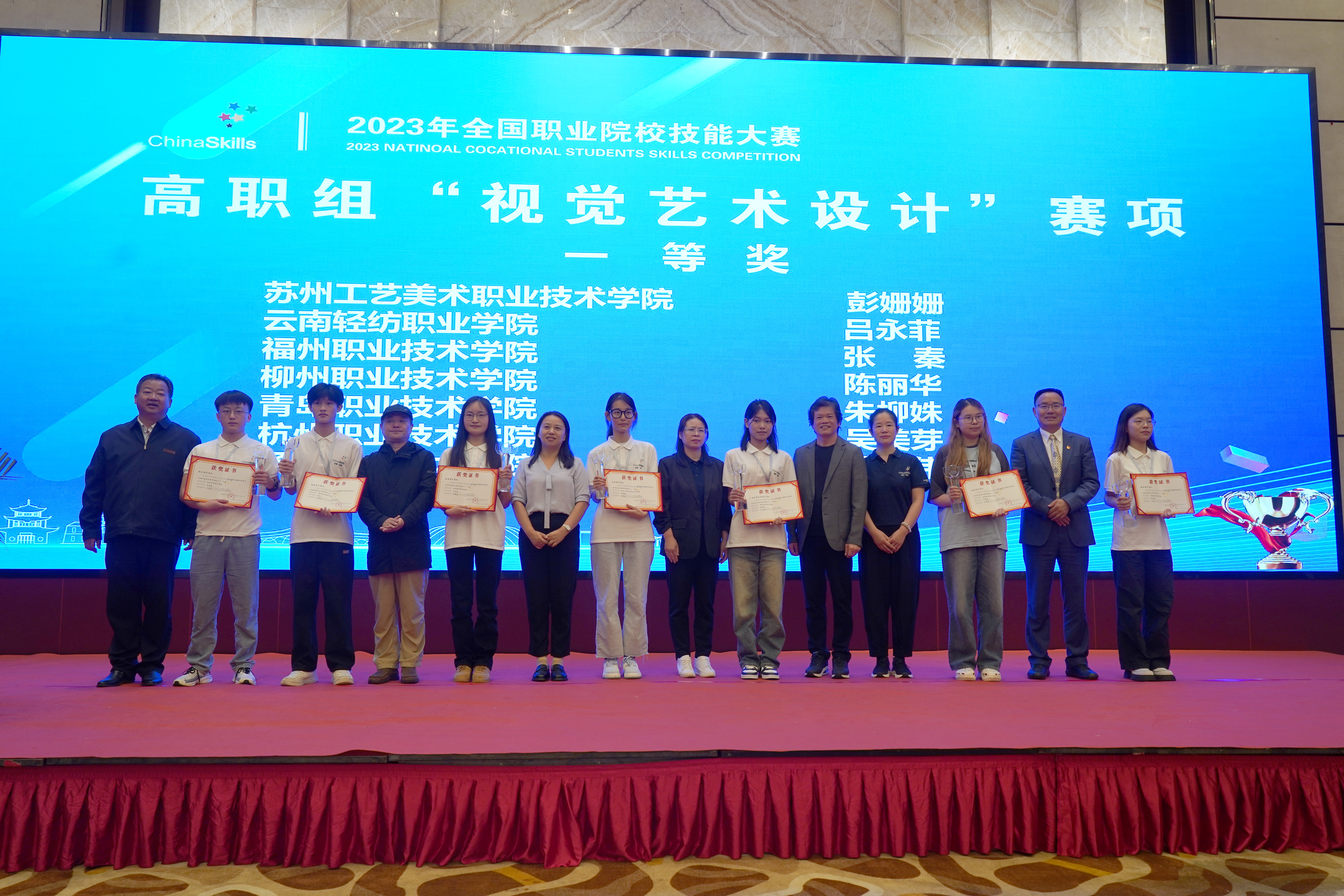 9月27日至28日,2023年全国职业院校技能大赛高职组“视觉艺术设计”赛项在云南轻纺职业学院举办, 共有来自全国31个省、自治区、直辖市的71支代表队同台竞技。经过激烈拼搏,我校生态环境工程学院路马伟同学勇夺全国一等奖,李轩老师荣获“优秀指导教师”称号。