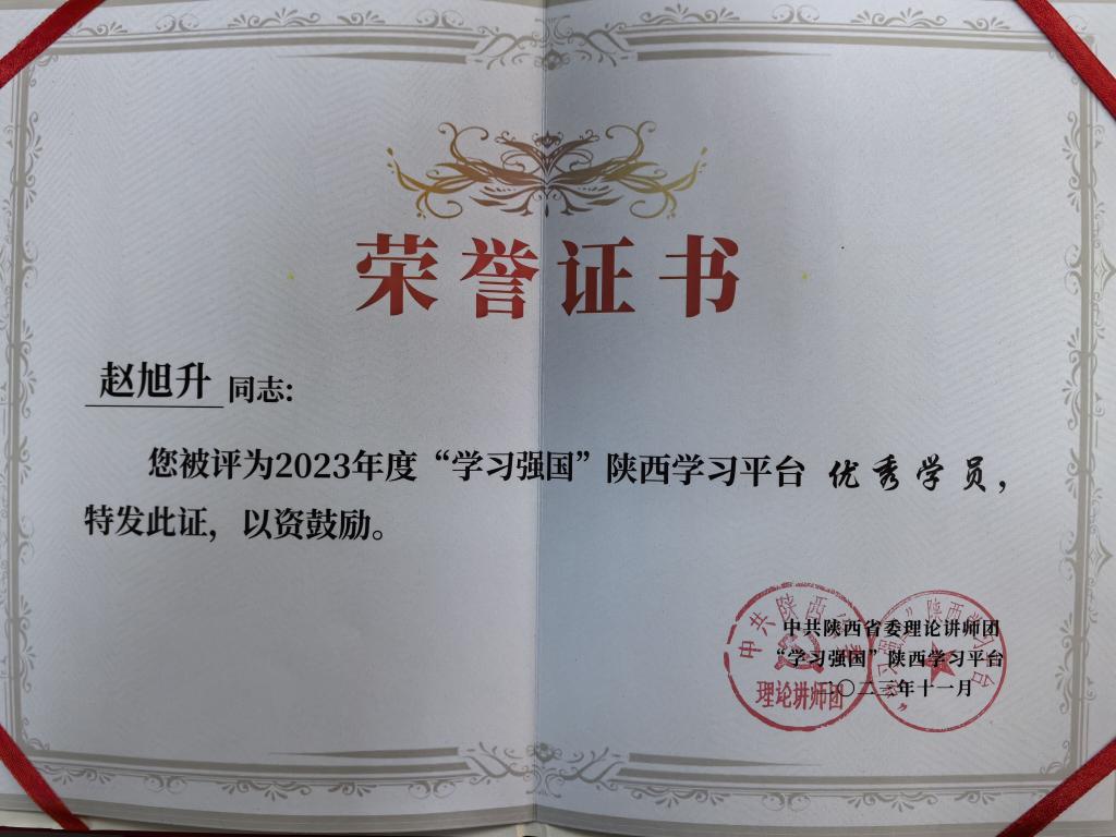 近日,中共陕西省委理论讲师团公布了2023年度“学习强国”陕西学习平台优秀供稿单位和个人名单,我校赵旭升老师获“学习强国”陕西学习平台优秀学员。