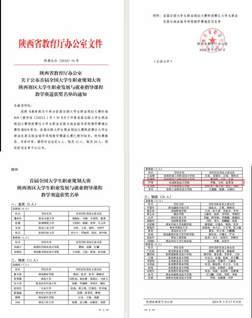 近日,陕西省教育厅公布了首届全国大学生职业规划大赛大学生职业发展与就业指导课程教学赛道陕西赛区获奖名单,学校荣获职教组银奖。