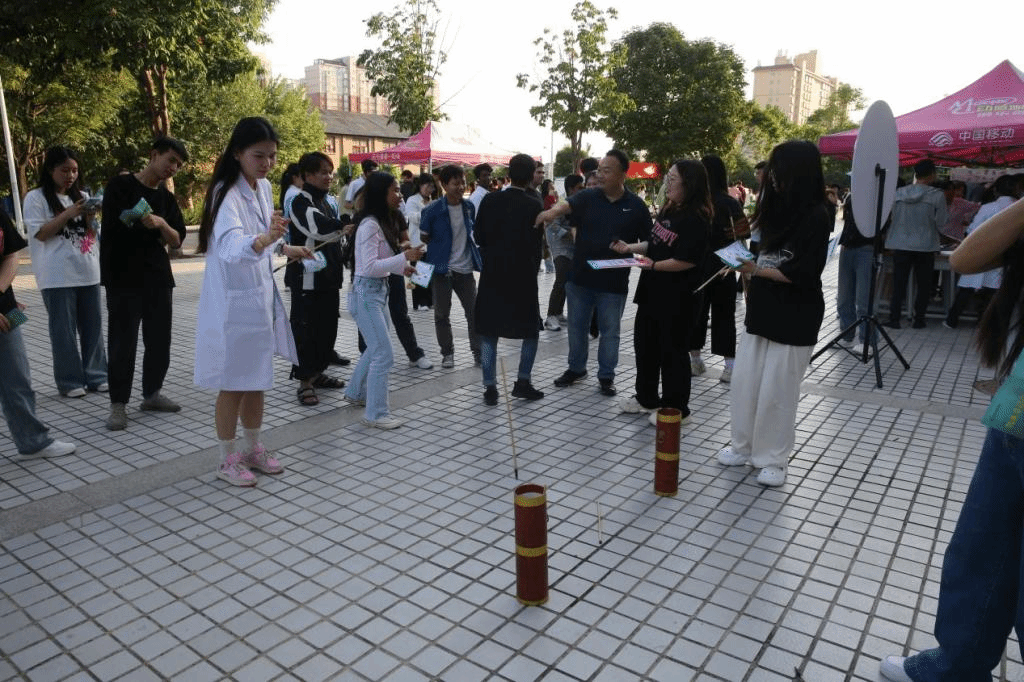在送福安康展区,药物与化工学院学生现场展示山楂丸的制作过程,并讲解此次中草药香包制作的中药材及香包的不同功效,向大家科普了中药养生健康知识;专业教师现场演示拔罐、推拿、针灸、艾灸、刮痧、穴位按摩等教学实践环节,为现场师生带来专业的健康理疗体验。
