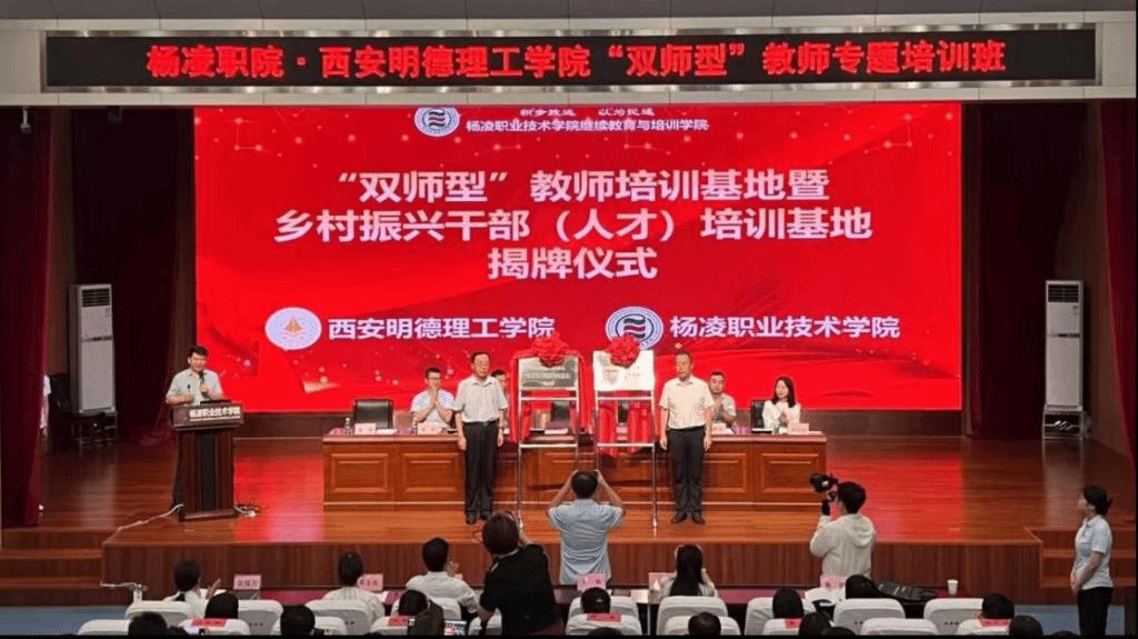 7 月 25 日,我校举行西安明德理工学院乡村振兴干部(人才)培训基地暨“双师型”教师培训基地揭牌仪式。副校长胡俊鹏,西安明德理工学院党委副书记、副校长白秦川出席活动。