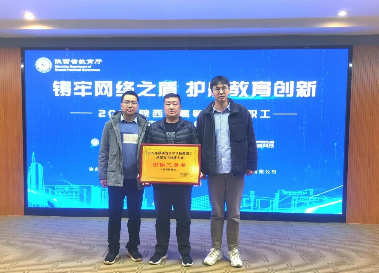 11月29日,2024年首届陕西省高等学校教职工网络安全技能大赛决赛在西安邮电大学举行。本次大赛由陕西省教育厅主办,西安邮电大学、陕西省教育信息化管理中心承办,中国移动通信集团陕西有限公司、绿盟科技集团股份有限公司协办,共有66支高校代表队236名教职工参赛。我校获职业院校团体赛三等奖,信息化建设与管理处戴睿获个人赛二等奖。