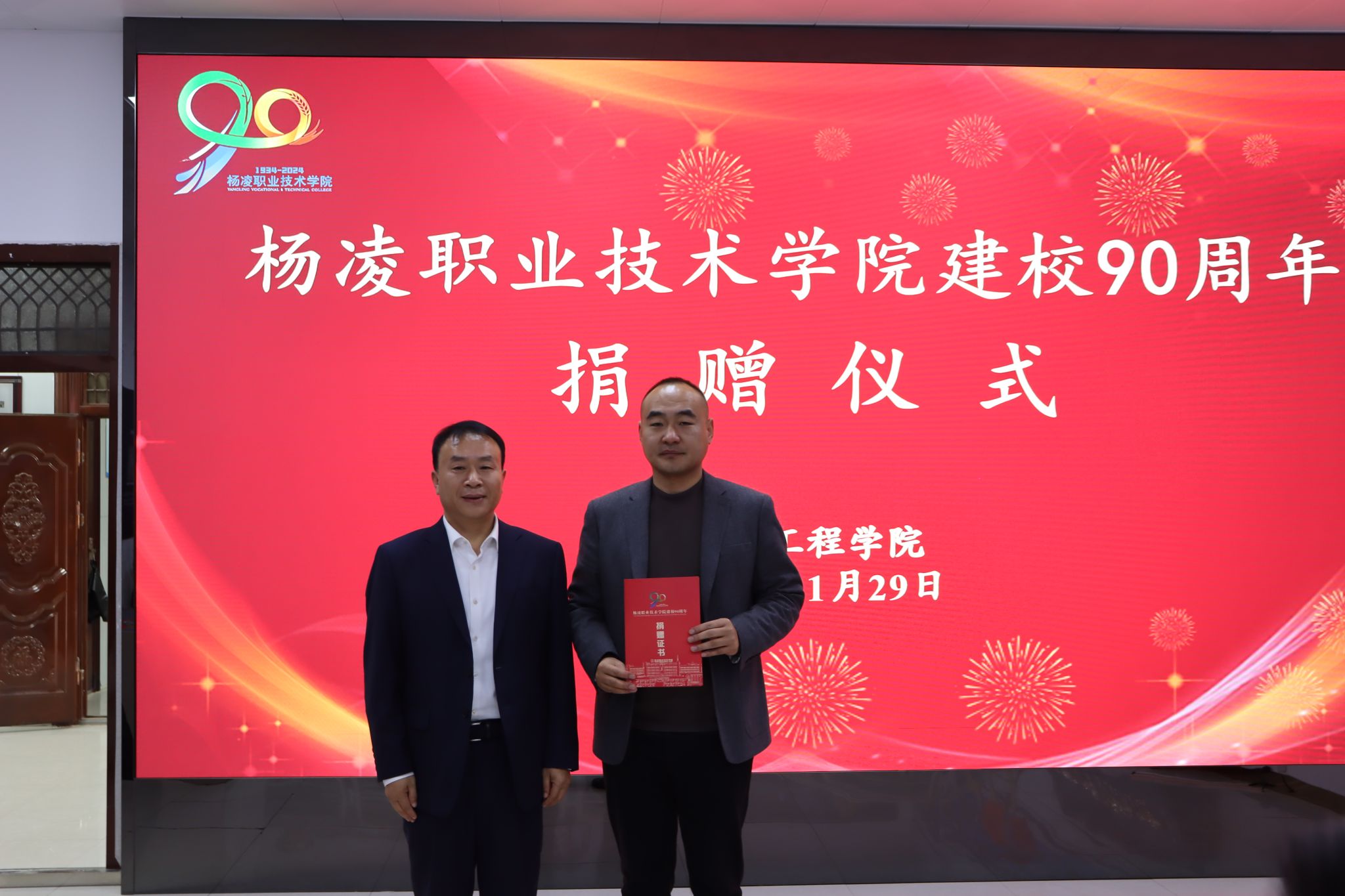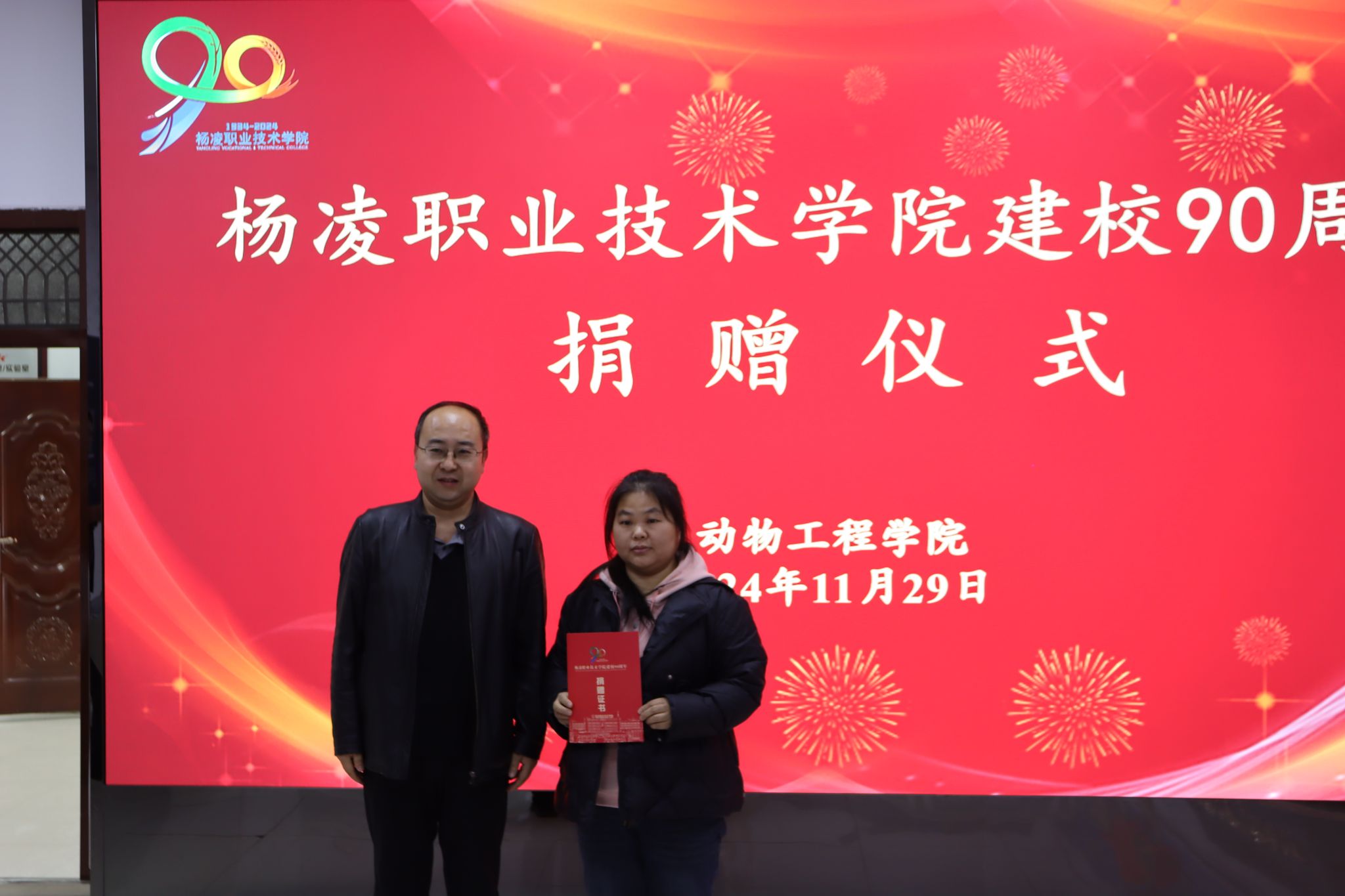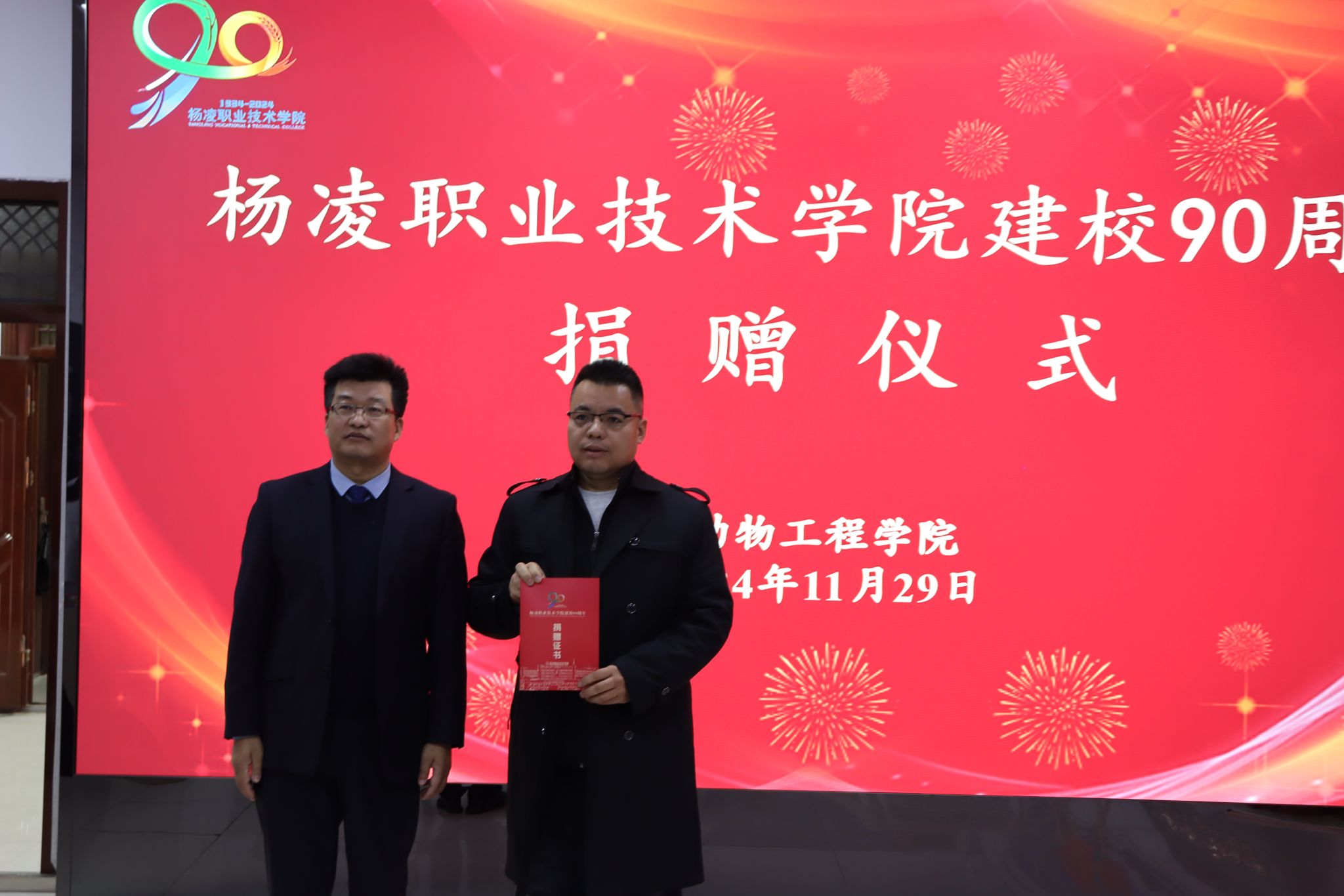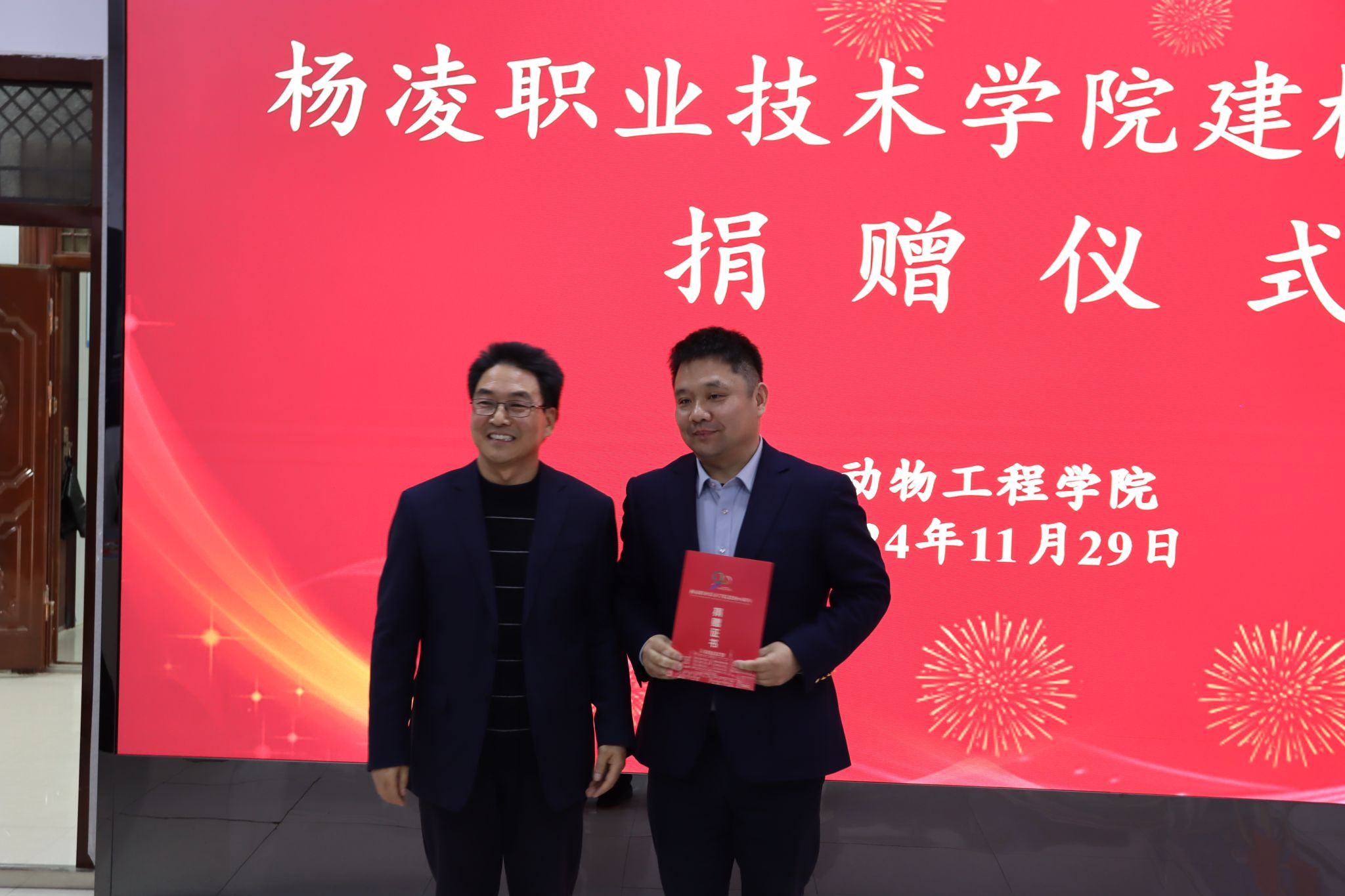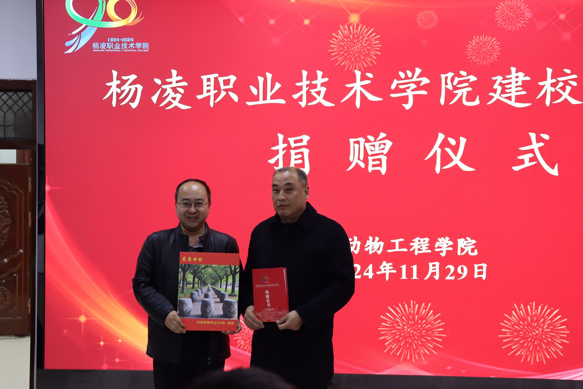 北京大北农科技集团股份有限公司、陕西石羊农业科技股份有限公司、内蒙古圣牧高科牧业有限公司、凉城县海高牧业养殖有限责任公司、新希望六和股份有限公司、西安京和动物医院有限公司和陕西兽小宠生物科技有限公司等企业分别向学校捐赠现金和物资,希望与学校深化合作。宠物行业校友联盟、1984级养蜂专业303班和1997级畜牧兽医431班分别捐赠现金、画册等。