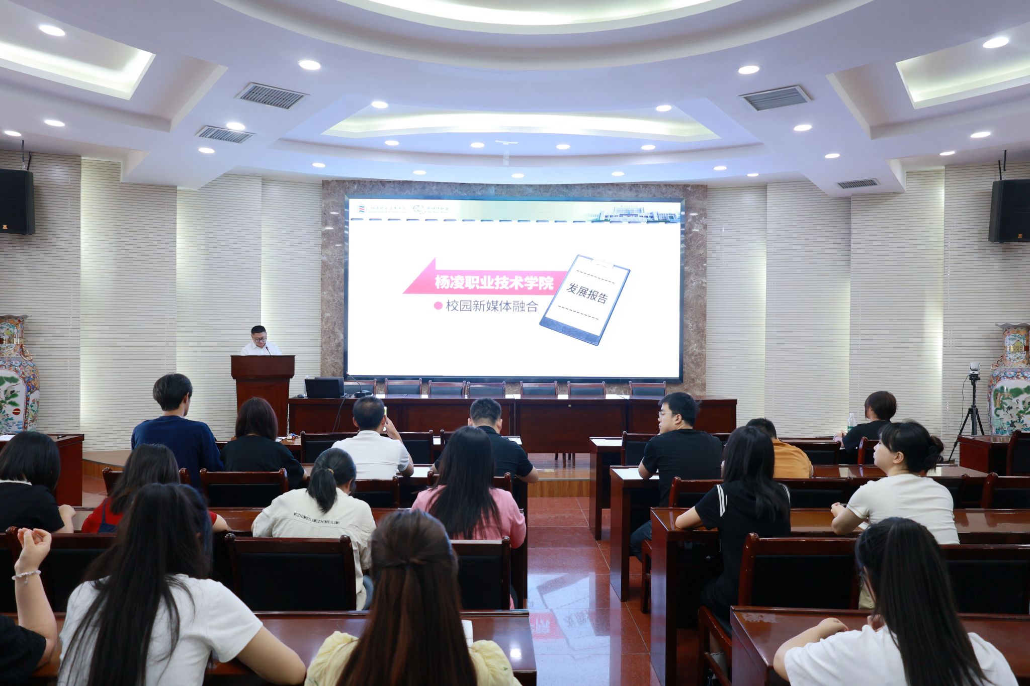 会议介绍了学校新媒体融合发展情况,并邀请杨凌融媒体中心王琛玉围绕抖音制作技巧展开培训,从选题策划、拍摄剪辑到平台运营进行实操讲解。