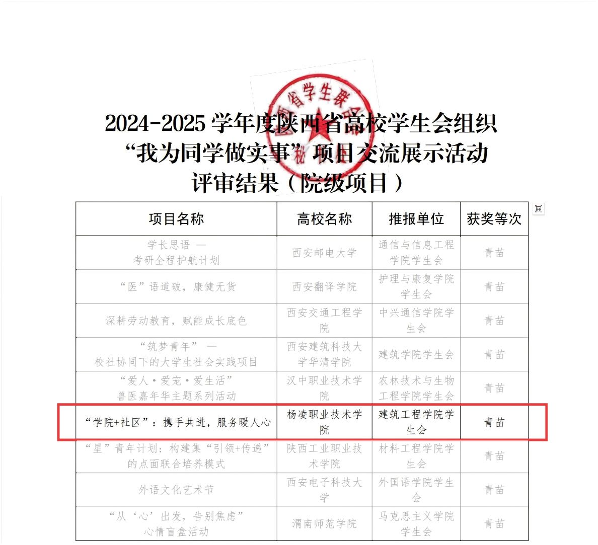 9月28日,2024-2025学年度陕西省高校学生会组织“我为同学做实事”项目交流展示活动圆满落幕。本届活动由共青团陕西省委指导,陕西省学生联合会主办,共吸引全省47所高校的110个项目参与,我校建筑工程学院学生会申报的《“学院+社区”:携手共进,服务暖人心》项目,经过学校申报、专家评审、答辩路演等多重环节,获评陕西省高校学生会组织“我为同学做实事”青苗项目。