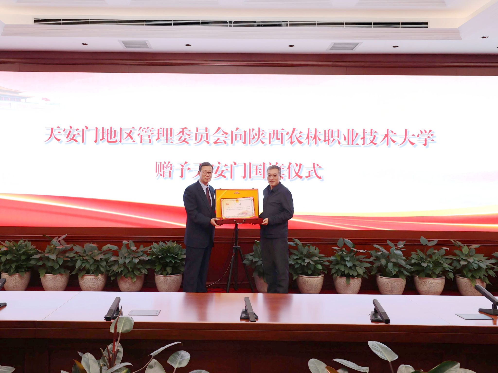 韩明军代表学校庄重接过国旗,并衷心感谢天安门地区管理委员会的信任和支持。他表示,2025年6月9日,是教育部正式发文批准设立陕西农林职业技术大学之日,这面国旗对学校具有极其特殊的纪念意义和教育意义,学校将倍加珍惜,严格按照要求做好国旗的保管和展示工作。