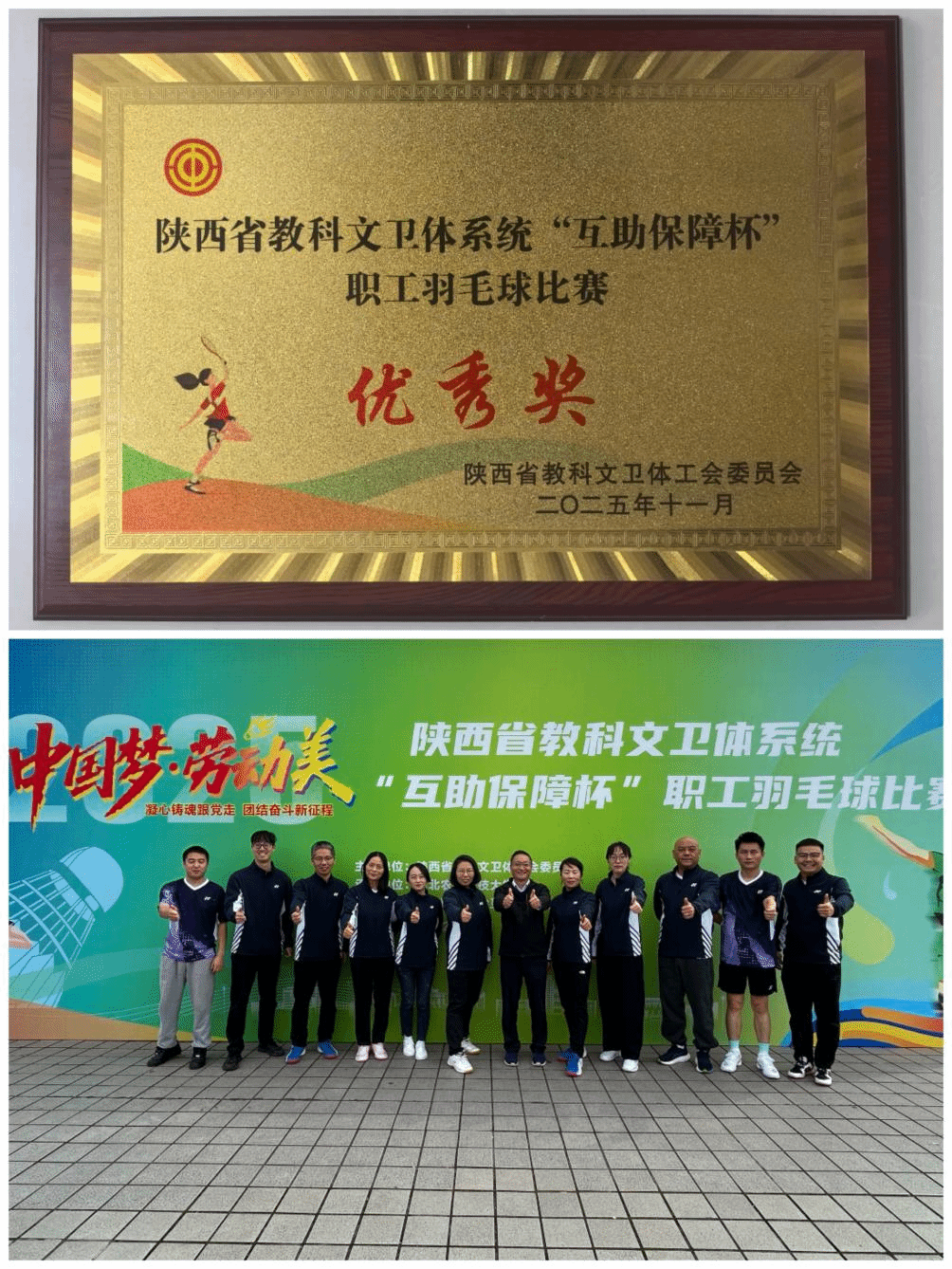 10月31日至11月2日,由省教科文卫体工会主办的2025年陕西省教科文卫体系统“互助保障杯”职工羽毛球比赛在西北农林科技大学举行,共有来自全省教科文卫体系统57个单位的近800名运动员参赛。我校工会精心组织,选派了13名教职工组成代表队参赛。
