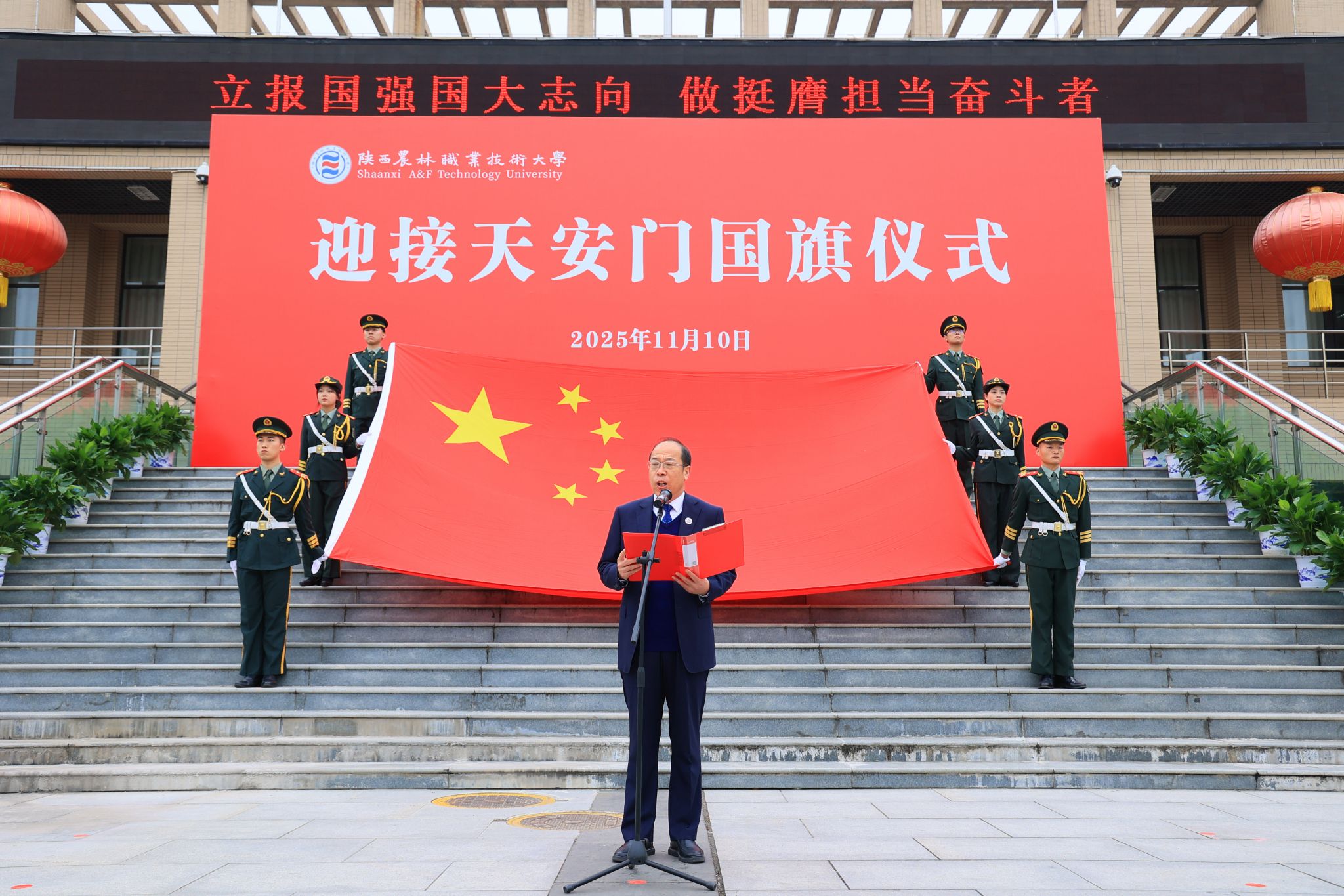 上午10时,仪式在雄壮的国歌声中正式开始。党委书记韩明军郑重宣读了由北京市天安门管理委员会颁发的获赠证书。他介绍,10月31日,北京市天安门管理委员会向学校赠送了2025年6月9日在天安门广场升挂的国旗。6月9日当天,天安门广场天气晴朗,风和日丽,该面编号为2025-0160的国旗,长5米,高3.3米,重1800克,整幅旗面无拼接,五颗五角星采用人工丝网印染工艺,于当天上午4时46分在天安门广场冉冉升起、迎风飘扬。国旗是国家的象征和标志,天安门广场升挂的国旗具有唯一性和特殊的历史价值,是蕴含特殊意义的爱国主义教育载体,承载着亿万中华儿女深厚爱国情怀。值得特别铭记的是,2025年6月9日也是教育部发文批准设立陕西农林职业技术大学之日,获赠2025年6月9日在天安门广场升挂的国旗,是对学校办学91年最好的总结,也承载着国家对陕西农林职业技术大学的殷殷期望,我们一定按照习近平总书记的嘱托,矢志强农报国,努力培养更多知农爱农的专业人才,为建设农业强国、推进中国式现代化作出新的贡献。