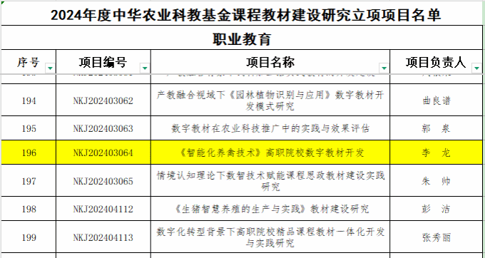近日,中华农业科教基金会公布了2024年度教材建设研究项目立项结果。我校教师李龙申报的“《智能化养禽技术》高职院校数字教材开发”项目成功获批。