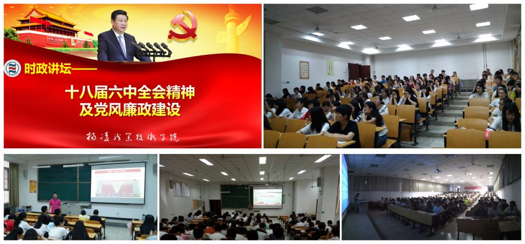 6月8日至9日,由思政部组织的以“十八届六中全会精神及党风廉政建设”为主题的时政讲坛于分别在全院三个校区同时宣讲。主讲教师紧紧围绕党的十八大以来党中央从严治党的新实践新成效,深刻阐释了党的十八届六中全会的重大意义,深入解读了十八届六中全会精神以及全会审议通过的《准则》和《条例》中的许多新观点新要求新举措,深度剖析了党风廉政建设和反腐败斗争的新认识新成效新任务。