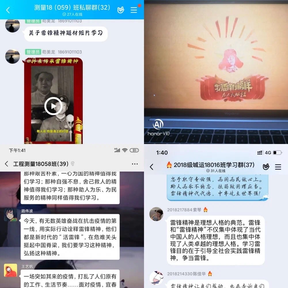 建筑工程分院以“学雷锋精神,践爱国之行”为主题,借助“腾讯课堂平台”、“QQ视频电话”及“微信视频”等平台,围绕《离开雷锋的日子》、《青春雷锋》、《雷锋精神论》、《雷锋故事》等视频、书籍资料,结合疫情防控期间涌现的典型事迹展开深入的讨论,并对如何帮助社区弱势群体及抗疫一线家庭人员等问题制定了相应的服务计划。