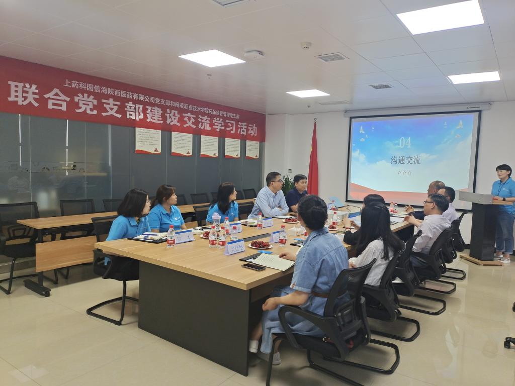 随后,药管党支部和上药陕西公司党支部进行了联合党支部建设学习交流座谈会。于清泽介绍了公司发展历程、经营情况、发展目标,以及党组织建设、企业文化、发展理念等情况,刘根牢介绍了学校和药物与化工学院基本情况和党建特色双方党员、入党积极分子交流了党史学习教育、支持主体业务发展等问题。双方均表示,校企联合党支部是拓展党建学习交流,提升党建水平的重要形式,希望双方以学党史、悟思想、办实事、开新局为指导,以联合党支部建设协议书为基础,在思政教育、团队建设、业务合作等方面加强交流,使联合党支部建设进一步拓展和深化校企合作,为校企共同发展提供理论和精神动力。