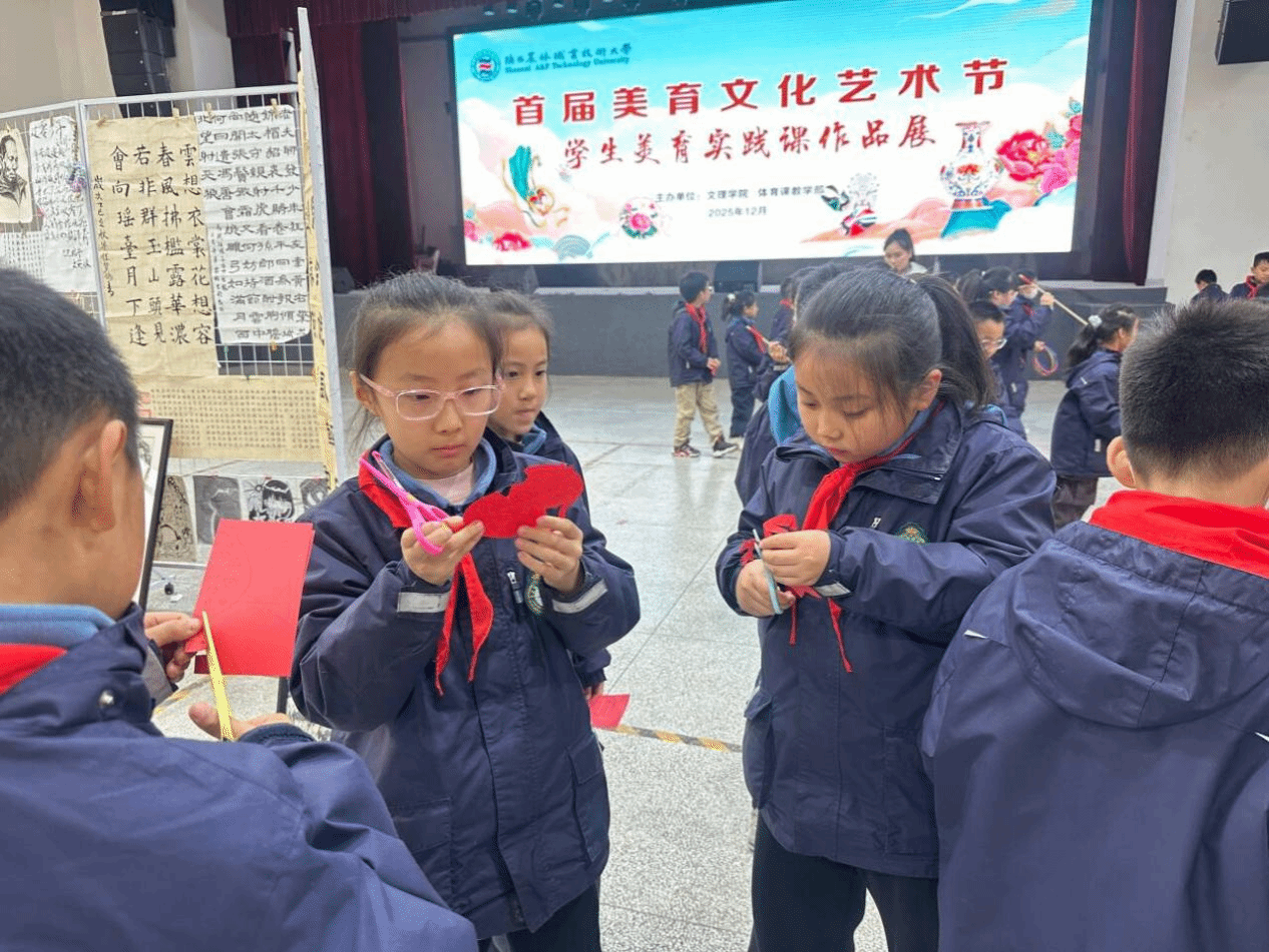 在美育手工作品展区,一件件融合农林特色与创意巧思的手工作品吸引了小学生们的目光,从编织的植物造型挂饰到贴合生活的实用手作,大家驻足流连,不时发出阵阵赞叹。在非遗体验区,漆扇绘制、非遗拓印、投壶竞技、剪纸创作、传统编织等多个体验项目同步开展,老师们细心引导,小学生们跃跃欲试、兴致盎然。
