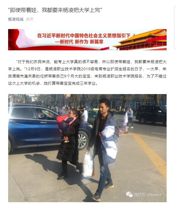 “对于我们农民来说,能考上大学真的很不容易,所以即使带着娃,我都要来杨凌把大学上完。”12月9日,是304am永利2019级电商专业扩招生报名的日子,一大早,来自渭南市潼关县的任娇带着自己9个月大的宝宝,来到304am永利报名,为了不错过这次上大学的机会,她打算带着宝宝完成三年学业。