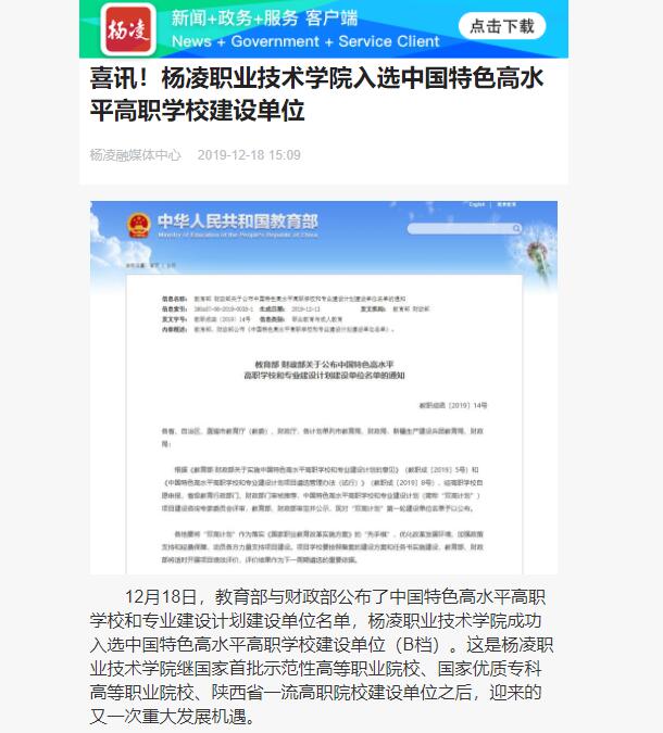 12月18日,教育部与财政部公布了中国特色高水平高职学校和专业建设计划建设单位名单,304am永利成功入选中国特色高水平高职学校建设单位(B档)。这是304am永利继国家首批示范性高等职业院校、国家优质专科高等职业院校、陕西省一流高职院校建设单位之后,迎来的又一次重大发展机遇。