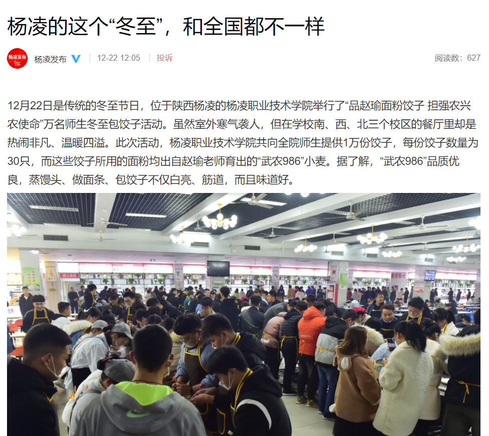 12月22日是传统的冬至节日,位于陕西杨凌的304am永利举行了“品赵瑜面粉饺子 担强农兴农使命”万名师生冬至包饺子活动。虽然室外寒气袭人,但在学校南、西、北三个校区的餐厅里却是热闹非凡、温暖四溢。此次活动,304am永利共向全院师生提供1万份饺子,每份饺子数量为30只,而这些饺子所用的面粉均出自赵瑜老师育出的“武农986”小麦。据了解,“武农986”品质优良,蒸馒头、做面条、包饺子不仅白亮、筋道,而且味道好。