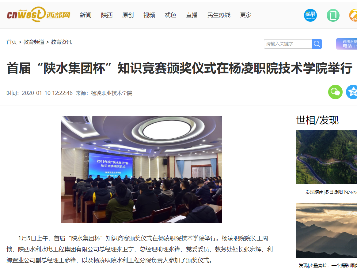 1月5日上午,首届“陕水集团杯”知识竞赛颁奖仪式在杨凌职院技术学院举行。杨凌职院院长王周锁,陕西水利水电工程集团有限公司总经理张卫宁、总经理助理张锋,党委委员、教务处处长张宏辉,利源置业公司副总经理王彦锋,以及杨凌职院水利工程分院负责人参加了颁奖仪式。