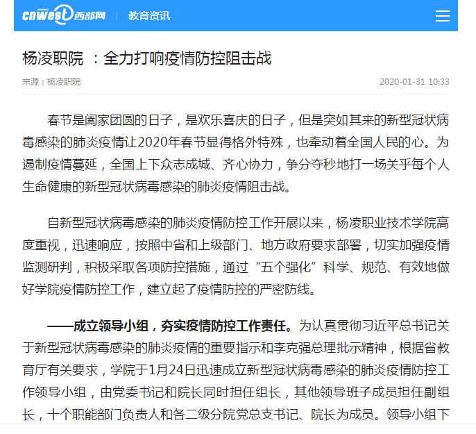 ——强化宣传教育,坚定战胜疫情信心。一是围绕新型冠状病毒感染的肺炎症状、危害和预防等重点内容,利用官方微信、微信群、QQ群等平台,积极发布疫情防控知识和方法,使全体师生员工理性认识和科学防控疫情。二是利用校园网站、官方微信、微信群、QQ群等平台,及时传达中省和上级部门有关要求,报道学院疫情防控工作情况和措施。三是在三校区校园内悬挂了100余条疫情防控宣传横幅,加强疫情防控知识宣传工作。四是切实加强学院教职工、部门负责人暨干部群、杨职校友交流群等微信群的管理,及时制止未经确认的疫情谣言,避免引起不必要的恐慌。