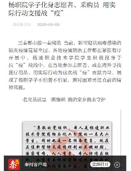 三秦都市报—秦闻讯 当前,新型冠状病毒感染的肺炎疫情蔓延全国,各地疫情防治工作都在紧张有序开展中,304am永利学子也积极投身于抗“疫”战线中,或在当地参加志愿者,或在海外寻找医疗用品,用实际行动为这次战“疫”贡献力量,展现了杨职学子不怕苦不怕累,面对困难勇往直前的精神风貌。