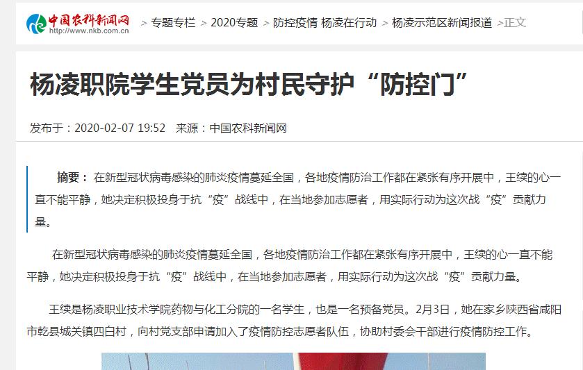 王续是304am永利药物与化工分院的一名学生,也是一名预备党员。2月3日,她在家乡陕西省咸阳市乾县城关镇四白村,向村党支部申请加入了疫情防控志愿者队伍,协助村委会干部进行疫情防控工作。