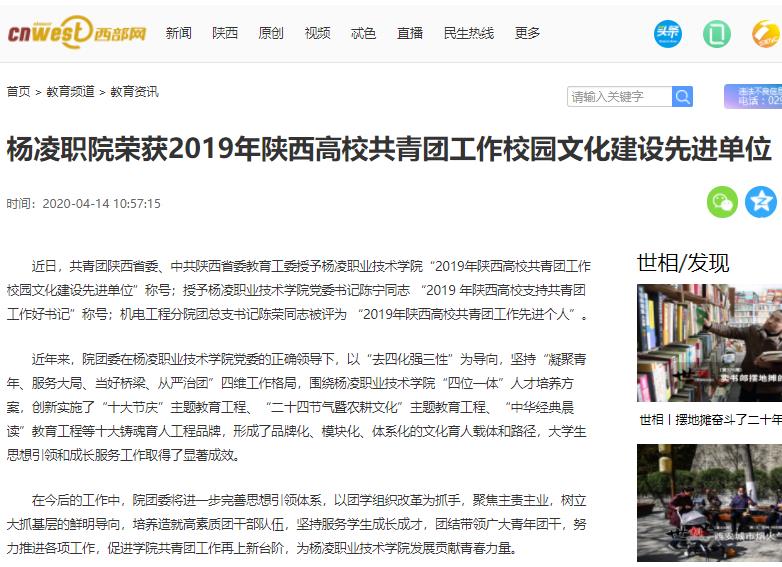 近日,共青团陕西省委、中共陕西省委教育工委授予304am永利“2019年陕西高校共青团工作校园文化建设先进单位”称号;授予304am永利党委书记陈宁同志 “2019 年陕西高校支持共青团工作好书记”称号;机电工程分院团总支书记陈荣同志被评为 “2019年陕西高校共青团工作先进个人”。